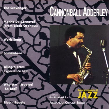 Sebbene siano circa quarantanni che corro dietro per mestiere ai musicisti, di jazz e d'altro, ho incontrato una sola volta Julian «Can-nonball» Adderley. È accaduto in occasione della prima edizione del festival del jazz di Bergamo, il 23 marzo 1969, pochi giorni dopo la registrazione di questo disco, che chiaramente è avvenuta nel corso della stessa tournée europea. Gli ho anche parlato, poche ore prima del concerto, mentre fra le panchine di un viale vicino al teatro Doni-zetti si lasciava fotografare da Roberto Polillo, talvolta da solo, talvolta assieme al fratello Nat. Portava una pelliccia da uomo (allora andavano di moda) e aveva un tratto pacioso e buono, in sintonia con la figura corpulenta. Mi conquistò con una chiacchierata informale e, più tardi, con la sua musica, la stessa che si ascolta qui, perfino con alcuni brani identici come (cito a memoria) The Scavenger di Zawinul e Man-ha de Carnaval di Jobim. Era un jazz vigoroso e divertente, il suo, assai determinato, ma nello stesso tempo preoccupato della platea e quindi spettacolare. Meglio dal vivo che nei dischi, mi dissi: e il nostro Cd ce lo fa ascoltare come in teatro. Prima non avevo amato Adderley quanto meritava: non gli perdonavo di rassomigliare troppo a Charlie Parker; ero d'accordo col mio amico Demètre Ioakimidis quando scriveva che «pur essendo il timbro quasi identico nei due musicisti, quello di Cannonball rimane più uniforme, perché gli manca il fremito vitale del suono di Parker, la sicurezza nell'uso dei contrasti che danno alle improvvisazioni di Bird il loro meraviglioso rilievo espressivo». Invece ritrovavo un grande sassofonista che ormai da Parker si era affrancato, e che shakerandolo con un po' di Benny Carter, un pizzico di John-ny Hodges e una quantità generosa di John Coltrane si era ritagliato uno stile personale. Non trascuriamo poi, fra gli altri, un Joe Zawinul acustico d'annata: bel tocco, buon gusto, forte creatività.